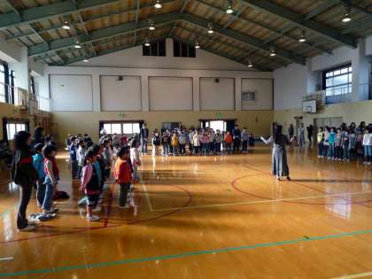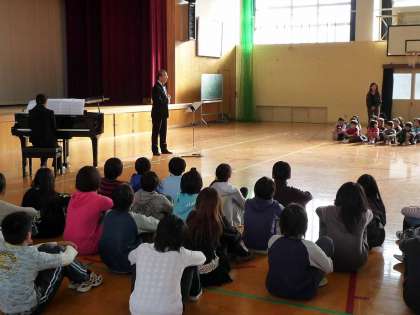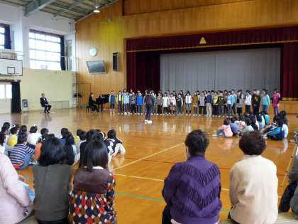 25日(水),5校時に体育館で音楽集会を開きました。5・6年生が低音部を歌う「気球乗ってどこまでも」で幕開けです。次に,今年度の近音研で研究演奏した5・6年生が,全校児童の前でもう一度,「光の中へ さあ君と」と「With You Smile」の合唱を披露しました。お兄さん,お姉さんのきれいな歌声が体育館に響き渡りました。続いて,ゲストの方の男声テノール独唱を聴かせていただきました。知っている曲では,一緒に口ずさんでいました。その声量と美しい響きにみんなうっとりしました。最後は,全員で,「With You Smile」を歌い,閉会しました。