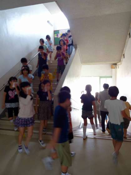 10日(火),今年度初めての避難訓練を行いました。大きな地震の後,家庭科室より火事が発生したという想定です。教室での1次避難のあと,運動場へ2次避難しました。緊急放送からほぼ3分余りで全校児童が安全に避難できました。避難中の様子は,「おはしもて」の約束を守り,概ね合格でしたが,もっともっと真剣に取り組まなければならない場面もありました。今年も,これからいろいろな想定で訓練を重ねていきます。