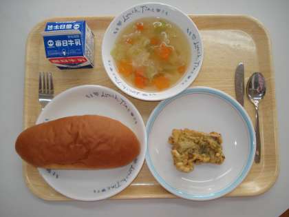 2日(水),6年生は,ランチルームでテーブルマナーを学びながら,給食をいただきました。メニューは,「ミルクコッペパン,牛乳,さわらの香草あげ,野菜のスープ煮」でした。