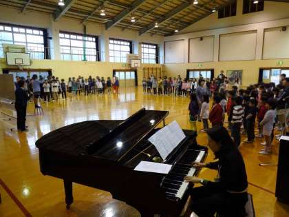 2日(月),第3回音楽集会をもちました。みんながずっと歌ってきた「花は咲く」,いよいよ声を合わせて合唱の練習です。高学年の副旋律と低・中学年の主旋律が響き合いました。歌った後の感想発表では,「音の重なりのきれいさ」に気づく声も聞かれました。今回もスクールサポーターの井上先生に,ピアノ伴奏と歌唱指導をしていただきました。