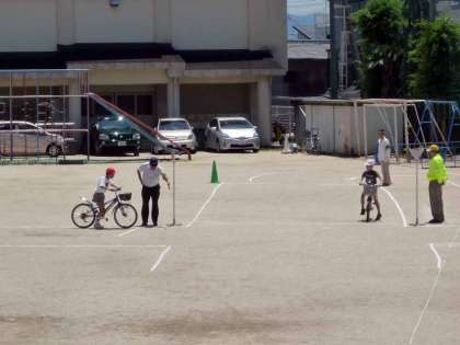 3年生の自転車教室を行いました。北警察署の交通巡視員の方,柏野交通安全対策協議会の方,見守り隊の方々に安全な自転車の乗り方を指導していただきました。実際に自転車に乗って交差点での走り方,曲がり方の練習をしました。