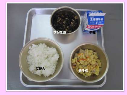 今日の給食の献立は,「親子煮」「ひじき豆」「ごはん」「牛乳」です。