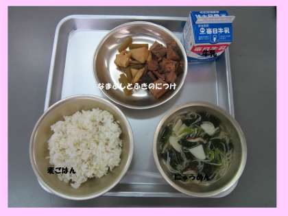 今日の給食は,「麦ごはん」「にゅうめん」「なまぶしとふきの煮つけ」「牛乳」です。