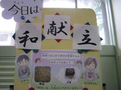 今日は,和献立です。献立は,「ごはん」「若竹汁」「小松菜と湯葉の煮びたし」「きびなごのこはくあげ」です。