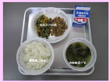 今日の給食の献立は,「胚芽米ごはん」「わかめスープ」「ビビンバの具」「牛乳」です。