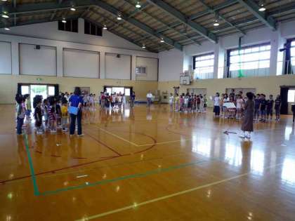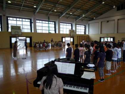 5日朝,今年度はじめてのミニ音楽集会を開きました。全校児童が体育館に集まり,日頃から練習している歌「世界が一つになるまで」をいっしょに歌いました。高学年の児童が副旋律を歌い,最後は全校で合唱してみました。響き合ってとてもきれいな歌声でした。