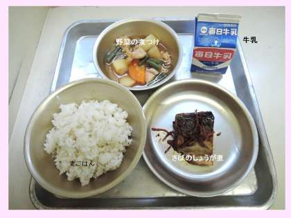 今日の給食の献立は「麦ごはん」「牛乳」「さばのしょうが煮」「野菜の煮つけ」です。
