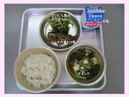 今日の給食の献立は「麦ごはん」「牛乳」「さんまの変わり煮」「だいこん葉のいためもの」「すまし汁」です。