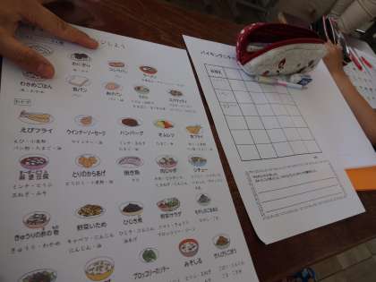 机の上で練習したバイキングでは,好きなものを選ぶ子どもや油をとらないようにした子,いろいろな食材が取れるように考えた子…たくさんの工夫がありました。
