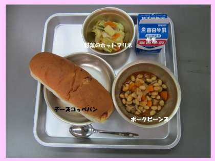 今日の給食の献立は,「チーズコッペパン」「ポークビーンズ」「野菜のホットマリネ」「牛乳」です。