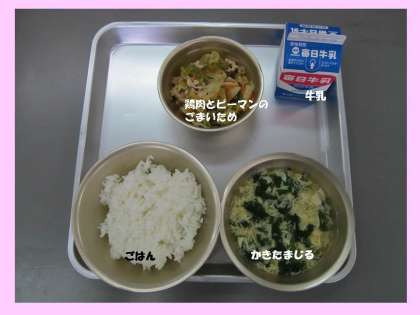 今日の給食は,「ごはん」「かきたまじる」「鶏肉とピーマンのごまいため」「牛乳」です。