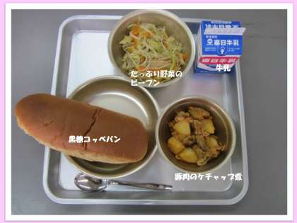 今日の給食は,「黒糖コッペパン」「たっぷり野菜のビーフン」「豚肉のケチャップ煮」「牛乳」です。