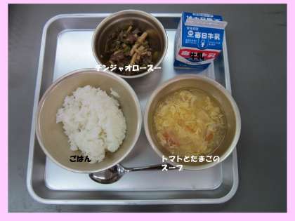 今日の献立は,「ごはん」「トマトとたまごのスープ」「チンジャオロースー」「牛乳」です。