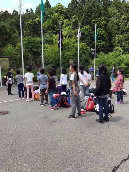 晴天のもと,山の家の入所式を終え,翔鸞小と合同で竹ばしづくりに取り組んでいます。