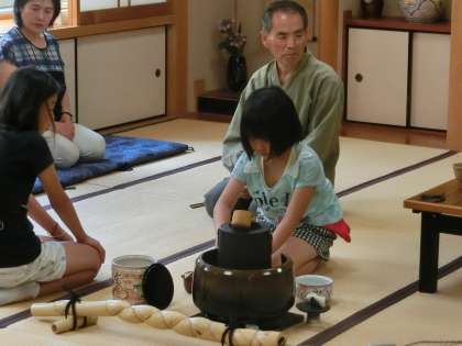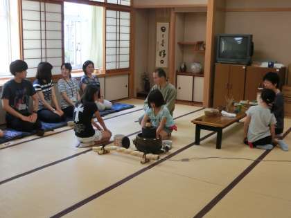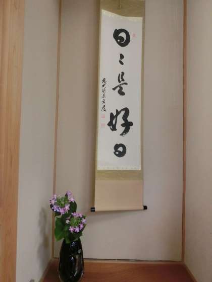 土曜日の茶道教室では,茶道を通して,礼儀作法と人をもてなす心を磨いています。床の間には,季節を感じる紫陽花が飾られていました。