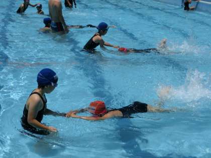 バディーで組んだ友達が,「ふしうき」でどこまで息が続くかを見込んで,少し離れた場所で手を差し伸べます。