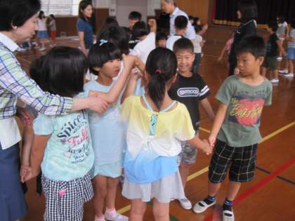 そのあとの,なかよし遊びでは,「猛獣狩りに行こうよ」と「人間知恵の輪」をしました。グループの人の手をお互いにしっかりとにぎって,そのからまった手を協力してほどいていきました。