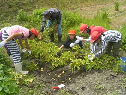 女子がお世話になるお宅につくと、さっそく今日の晩御飯の食材を取りに畑に向かうことになりました。まずは、ジャガイモを掘り出しました。畑には、様々な食材があります。さあ、今日の晩御飯は何かな?