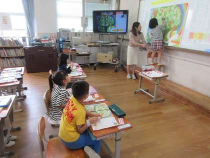ものの個数を数えて絵や図に表して整理したり,その特徴を読み取ったりできるようにすることがねらいとなっています。教科書の挿絵をみて,くだもの種類ごとに数を数え,絵グラフに色をぬって,どの果物が多いかをみつける学習を進めました。