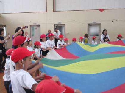 プログラムは開会式・準備運動の後,徒競走「きたしもマーメイド」,「ババババババルーンでGО!」リレー「アンパンマン新しいタオルよ!」ハードル走「ミツバチのぼうけん」フォークダンス「楽しくおどろう」です。