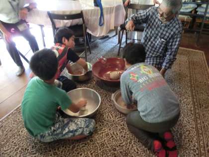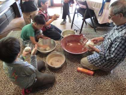 民泊先を覗くと,男の子たちは,夕飯のうどんの生地をこねていました。「かくし味は,鰹節です!」「それを言ったらかくし味にならんやろ。」と,とても楽しそうに会話をしながら,師匠にならってうどん作りに精を出していました。