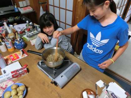 台所では,山椒の実とじゃこを使って佃煮を作っていました。明日の朝食は,ごはん食だそうですよ。