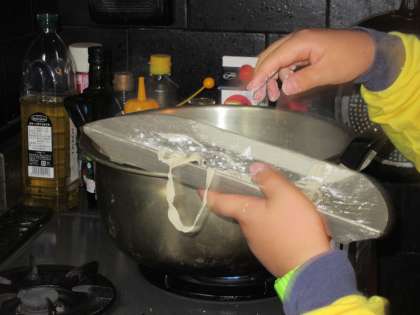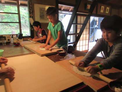 水鉄砲を作った後は,寝かせていたうどんの生地を麺棒でのばしていよいようどん作りのクライマックスです。