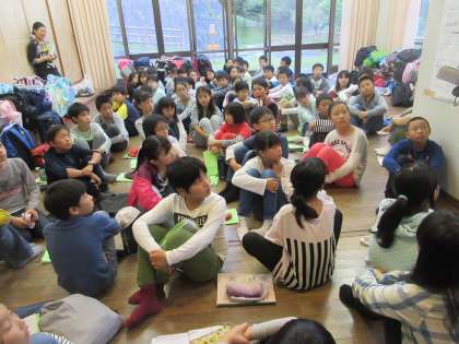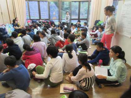 二日目の夕食後は,紫野小学校と合同の生活班・係で班会議・係会議を行いました。