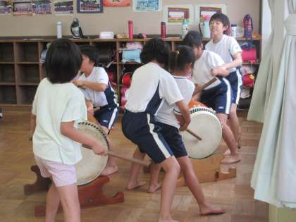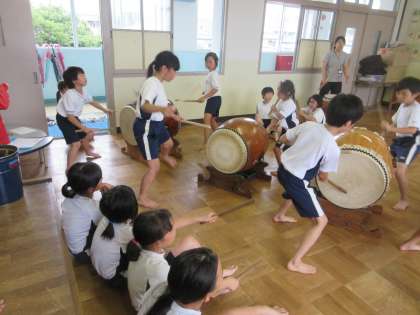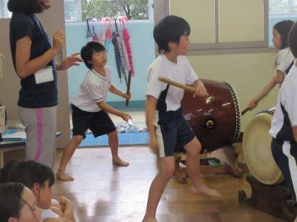 この日は,3年生の二人だけの参加でしたが,紫野小学校の上級生に教えてもらいだんだんと上手に叩けるようになってきました。