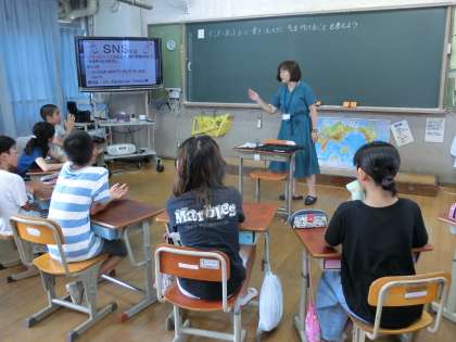今日は,6年生の教室に情報モラル市民インストラクターの先生にお越しいただき,インターネットのSNS(ソーシャル ネットワーキング サービス)に潜む危険をどう回避していけばよいか教えていただきました。