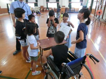7月のなかよし集会を行いました。もうすぐ夏休み。そこで,なかよしグループで1学期を振り返って「サイコロトーク」をしました。サイコロの6つの目にそれぞれお題を決めて,ふって出た目の数にあたる振り返りのお題について,グループのみんなにお話しするというゲームです。