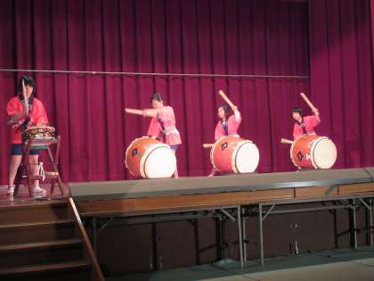 児童代表のはじめの言葉で最後の学芸会をすばらしいものにするためにがんばることを発表し意気込みを語ってくれました。プログラムのトップは和太鼓部による「三宅太鼓」の勇壮な演奏でプログラムが始まっていきました。