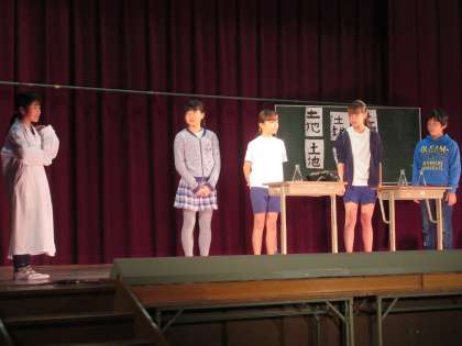 学年で最初に登場したのは5年生です。劇「時をかける」。時間を操ることができるリモコンを手に入れた主人公のりょうまが,時間を停止・早送り・巻き戻しして都合の良いようにコントロールして日々を過ごします。しかし調子に乗って,使用制限を超えてしまいます。そして友達の危機を救おうとして,どんどん若返ってしまいます。やり直しのきかに時間の大切さを考えさせられる劇でした。