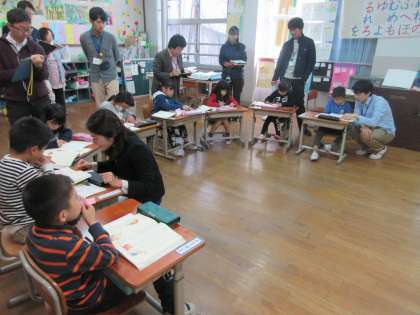 指導には特別訪問指導員の荒井あや子先生に来ていただき,「言語活動の有効な設定の仕方や流れ」「言語環境の充実・整備」「書くことの効果的な指導」等についてアドバイスをいただきながら,具体的によりよい取り組み方について教えていただきました