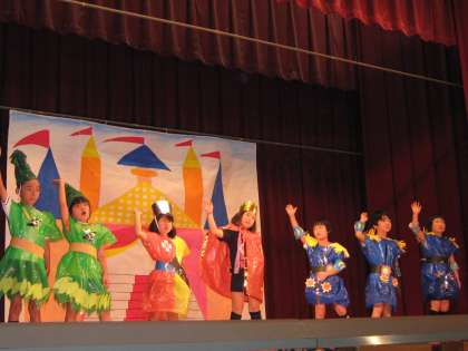 「ぞうのたまごのたまごやき」を2年生7人が明るく演じている姿です。