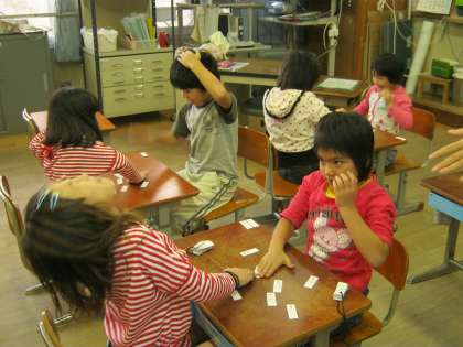 2年生は,勉強しているかけ算をカードに書いて,どちらが答えのカードを取るのが早いかをペアで競い合っています。必死で競い合い楽しんでいる姿が素晴らしいです。
