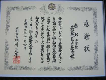 先日,京都市教育委員会より自主的な学びの場と安心安全な居場所づくりに対して,感謝状をいただきました。