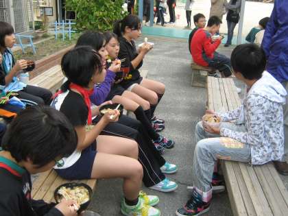 昼食はおやじの会やPTAの方にお世話になり中華丼をいただきました。とてもおいしくて,みんな笑顔で食べていました。ありがとうございました。