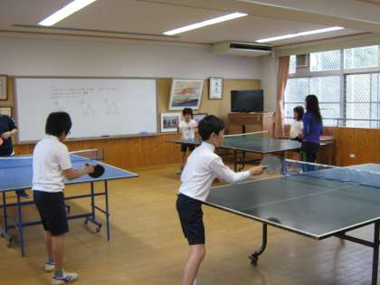 屋外スポーツクラブはみんなで種目を話し合った後,運動場でキックベースをしました。卓球クラブは3つのグループに分かれて試合を楽しみました。
