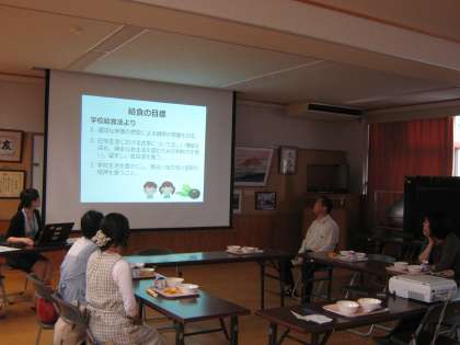 自由参観の中で給食試食会も行いました。栄養教諭から給食の変遷や現在の給食の様子などの説明をしました。参加人数は少なかったのですが,特に1年生の保護者の方にとって学校の給食の様子を知っていただくよい機会になったと思います。