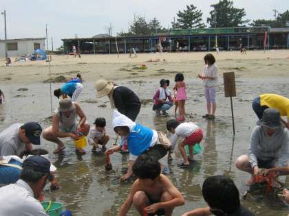 水難訓練の後は,御殿場浜で潮干狩りをみんなで楽しみました。みんな必死になって貝見つけに没頭していました。子どもたちもたくさんの貝が取れて大喜びでした。