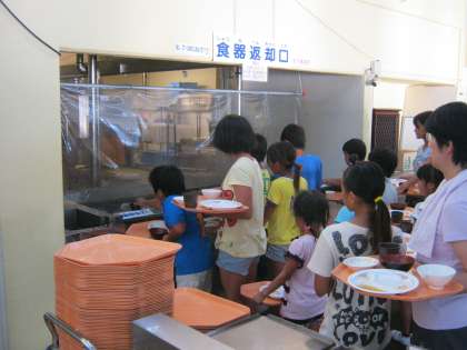 運動(水泳)した後は,お腹がすいているようで「おいしい,おいしい」と食べていました。他校や他団体のお友達とともに味わっていました。