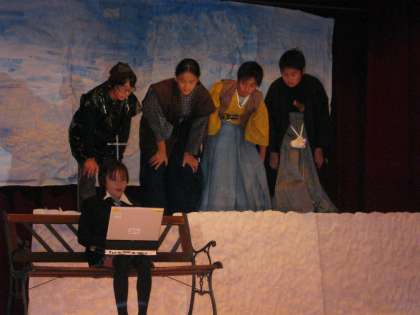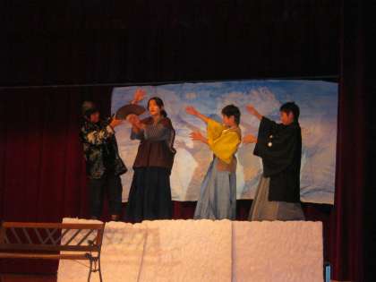 6年生は「雲の上から・・・」を演じました。歴史上の人物の同窓会から,現代を見つめ話しています。しかしそのうちに,今も昔も変わらないものに気付きました。変わらないものを大切にしていこうのメッセージを残してくれました。6年生にふさわしいダイナミックな劇でした。
