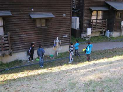 「お守り」を作った後は,『フライング ディスク ゴルフ』です。フリスビーのディスクをかごに入れる活動です。途中でディスクが川に落ちたり,あらぬ方向に飛んでいったりと,班でわいわいいいながら活動できました。