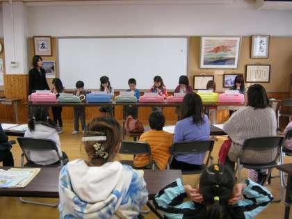 本日,来年度の1年生になる子ども達が,楽只校にやってきました。最初はふれあいサロンで保護者の方と一緒に,現在の1年生が披露した挨拶や音楽をしっかり聞いていました。その後,保護者の方には入学説明を,子どもたちには1年生の教室で「半日入学」を体験してもらいました。身体測定・帽子の採寸・ビデオ視聴・紙芝居・お絵かき等を行いました。緊張しながらもみんな楽しんでくれたようです。