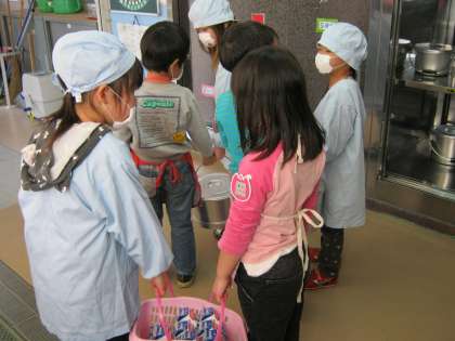 重たい食缶も1年生と保育所の子ども達が一緒になって運んでいました。落とさないようにゆっくりゆっくりと運んでいました。