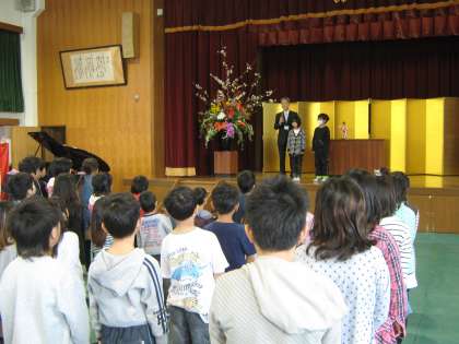 4月8日,新年度がスタートしました。一つずつ進級した子ども達は胸をわくわくさせながら元気に登校してきました。その後,着任式と始業式を行い,引き締まった雰囲気の中で新しい先生の紹介,転入生の紹介,担任発表,6年生の発表など行われました。みんな真剣に話を聞いていました。