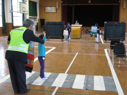 4月12日の3時間目に交通安全教室を行い,1・2年生の児童が参加しました。北警察署の方と地域交通安全推進委員さんに来て頂き,交通事故に会わないための安全な道路の歩き方を教えていただきました。後半は講堂の中を実際に歩いてみて,一人一人が安全に気をつけて歩けているかを確認しました。実際の道路でも安全な歩き方を実践してほしいと思います。