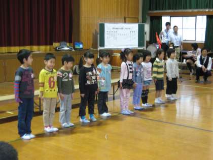 各学年からの発表の後は,全校で「進化じゃんけん」というゲームをしました。一年生も楽しそうにじゃんけんをしながら遊んでいました。最後に1年生が自己紹介とお礼の言葉を頑張って言いました。
