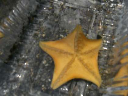 マリンランドの飼育員さんから、一人に一匹ずつヒトデをもらって観察しました。海水の入った透明の容器に、裏返しにヒトデを置くと、しばらくして、足が出てきて、1・2分すると、見事にひっくり返って、もとにもどりました。